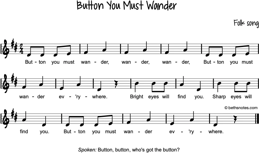 […] Button You Must Wonder: My students love this song. One person stands in the middle. Everyone else is in a circle, and they have to pass a button (or button like object) around the circle without the person in the middle noticing. At the end, the person in the middle tries to guess who has the button. You can play it with younger students but I think it is better with fifth grade because they have figured out how to be sneaky with it. […]