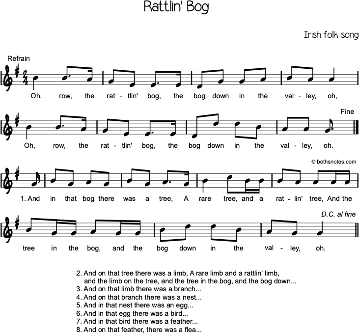 Oh row, the rattlin’ bog, the bog down in the valley-o. (repeat)