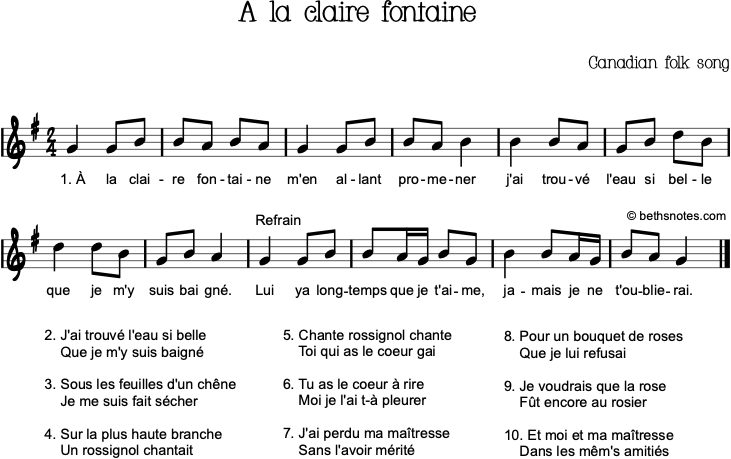 “À la claire fontaine” (“By the clear fountain”) is a traditional French song, which was probably brought to Canada as early as 1604. There are many different versions in France and Canada. (source)