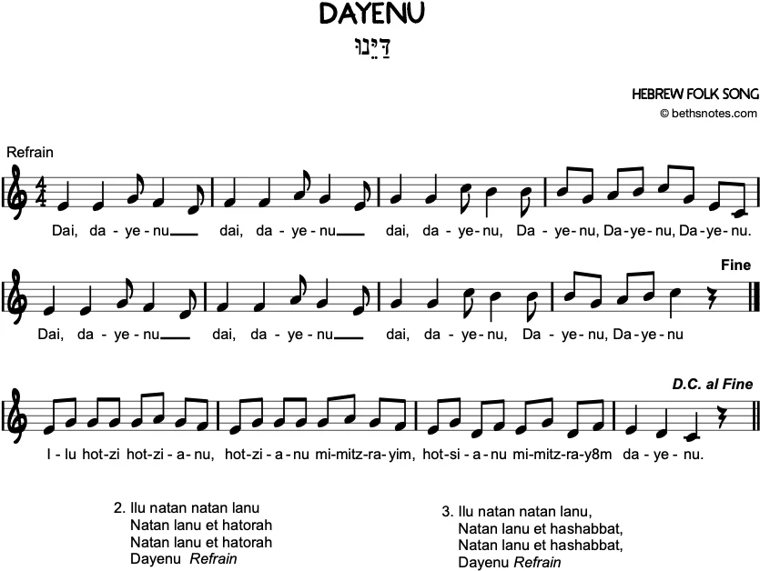 This song is over a thousand years old and is traditionally sung at Passover. There are a total of 15 verses. The word “Dayenu” means approximately “it would have been enough for us.” The song is about being grateful to God for all of the gifts he gave the Jewish people. (source)