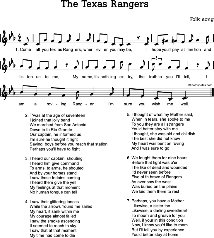long ago I heard Mike Seeger sing this on an album, accompanied by fiddle. But I can’t find that version now, and when I heard him in a solo concert many years later, he said he regretted ever performing the song and would never sing it again because it praised the murderous Rangers, one of whose purposes was to kill off Native Americans. I find this to be a sad deletion of a particular history.