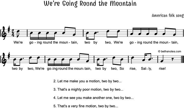 1. We’re going round the mountain, two by two, (repeat twice)