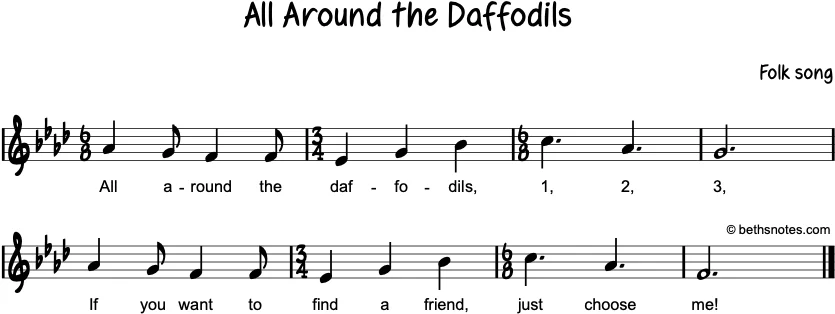 Version 1 – Formation: The children stand in a circle and hold hands up high to form “windows.” Choose one student as “It” (optional: “It” can hold fake daffodils, handkerchief or other item) and weave in and out of the windows. When the students sing, “just choose me,” “It” grabs the hand of whomever is the closest, and those the two students walk in and out of the windows. (You could have the second student become “It” and lead them through.) Keep singing until everyone is holding hands, and the teacher can make a window by putting hands against a wall, while everyone goes under the arch for the last time.