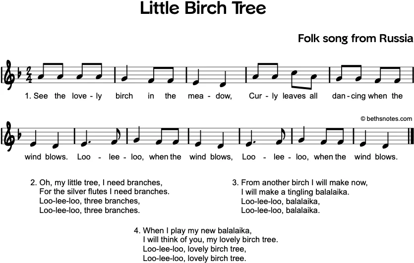 Over there an old lonely birch tree. Tall and strong lonely birch tree. Loo li loo lonely birch tree (x2). When I teach it in November, I’ll use the Russian lyrics and the English version I already know.