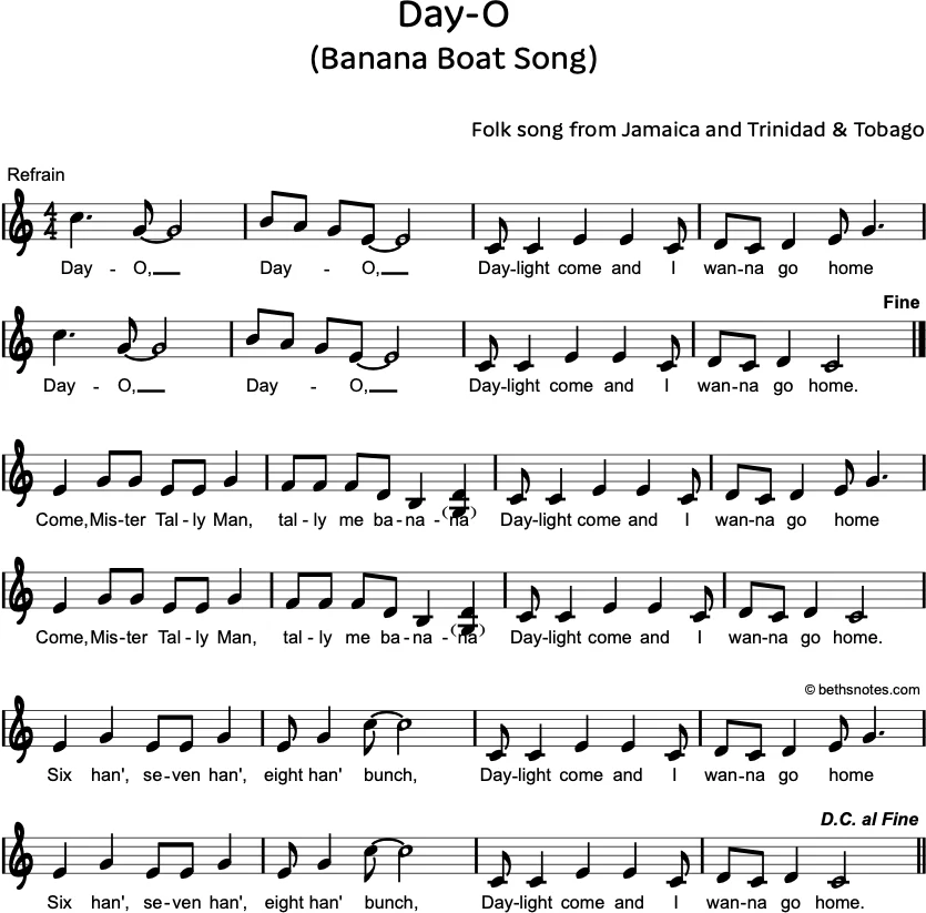 This is a work song, thought to be sung by Jamaican banana workers, working the night shift loading bananas onto ships. In the morning, they want their work to be counted up so that they can go home. There were numerous versions of lyrics, some likely improvised on the spot by the singers as a call and response. The song was probably created around the second half of the nineteenth century or the first half of twentieth century, where there was a rise of the banana trade in Jamaica. (source)