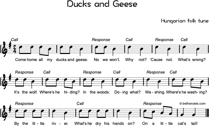 The Farmer sings the “Call,” and the rest of the students sing the “Response.” On the word “tail,” the students run toward the Farmer (you could designate an area near the Farmer as the “safe zone). The Wolf comes out of hiding and tries to tag a student.