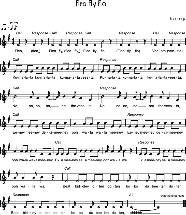 These are nonsense lyrics. There are lots of different versions of this song. Tempo: get faster as the students get better at it.