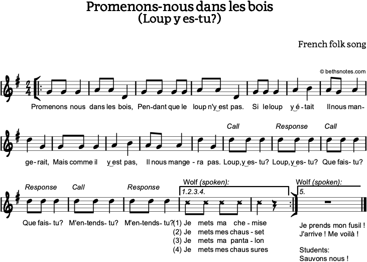 During the song, the students walk around. Each time, the students sing their questions to the Wolf, and the Wolf answers by saying they are putting on different pieces of clothing (other pieces can be added). The last time, the Wolf is ready and tries to catch the students. Whichever student is not caught becomes the new Wolf.