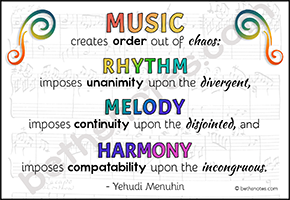 Music creates order out of chaos: for rhythm imposes unanimity upon the divergent, melody imposes continuity upon the disjointed, and harmony imposes compatibility upon the incongruous. – Yehudi Menuhin