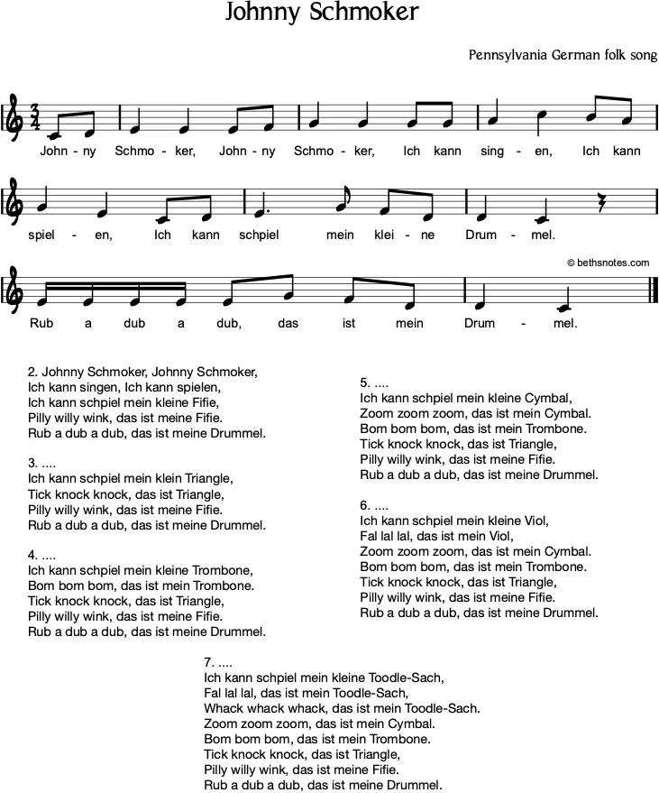 - Source:Pennsylvania German Secular Folksongs, Albert F. Buffington, The Pennsylvania German Society, 1974 (with the titleTschanni Schmoker) / Duke University