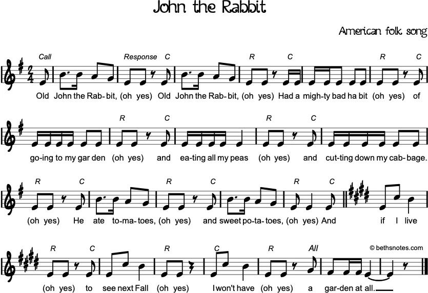 Lyrics (Folk song) Old John the Rabbit (oh yes!)Old John the Rabbit (oh yes!)Had a mighty bad habit (oh yes!)Of going to my garden (oh yes!)And eating all my peas (oh yes!)And cutting all my cabbage (oh yes!)He ate tomatoes (oh yes!)And sweet potatoes (oh yes!) ...