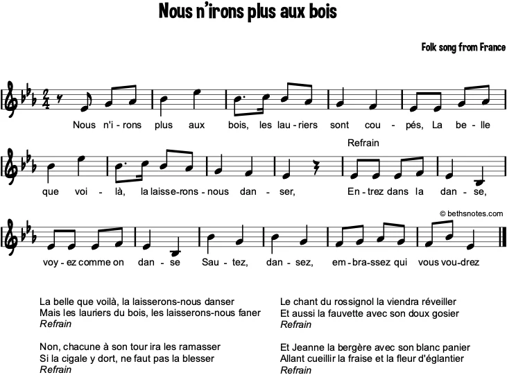 Lyrics (Folk song) Nous n’irons plus aux bois, les lauriers sont coupésLa belle que voilà , la laisserons-nous danser RefrainEntrez dans la danse, voyez comme on danseSautez, dansez, embrassez qui vous voudrez La belle que voilà , la laisserons-nous danserMais les lauriers ...