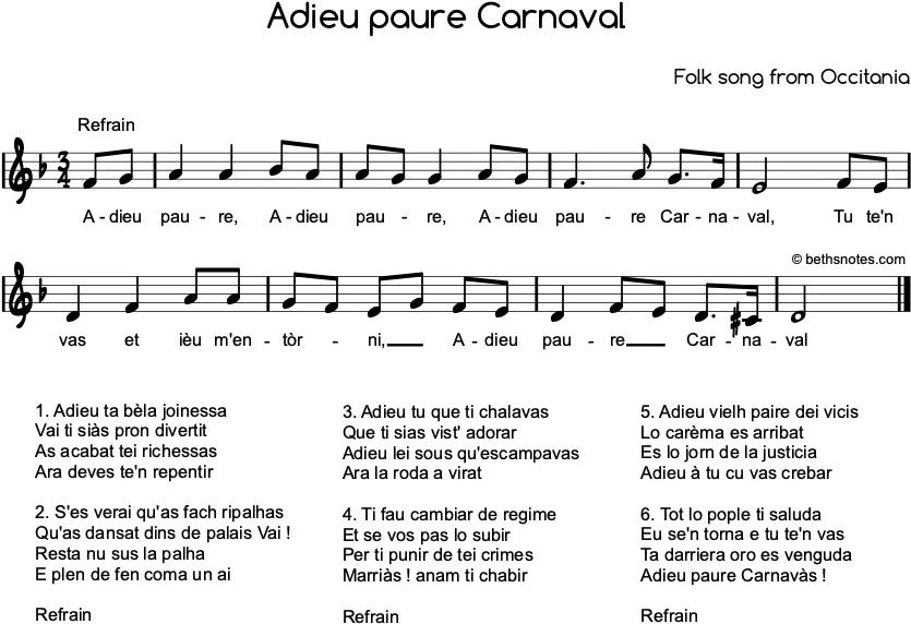 Lyrics – Occitan (Folk song from Occitania) RefrainAdieu paure, Adieu paure,Adieu paure Carnaval !Tu te’n vas et ièu m’entòrni,Adieu paure Carnaval ! 1. Adieu ta bèla joinessaVai ti siàs pron divertitAs acabat tei richessasAra deves te’n repentir 2. S’es verai ...