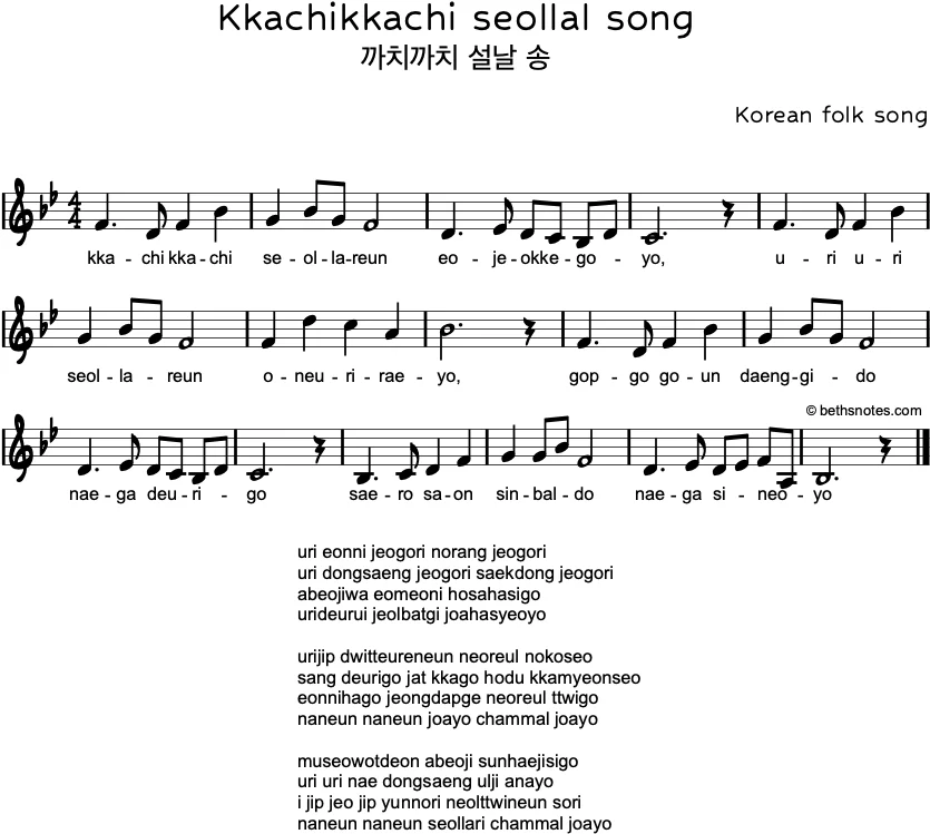 Lyrics – Transliteration (Korean folk song) kkachi kkachi seollareun eojeokkegoyouri uri seollareun oneuriraeyogopgo goun daenggido naega deurigosaero saon sinbaldo naega sineoyo uri eonni jeogori norang jeogoriuri dongsaeng jeogori saekdong jeogoriabeojiwa eomeoni hosahasigourideurui jeolbatgi joahasyeoyo urijip dwitteureneun neoreul nokoseosang deurigo jat ...