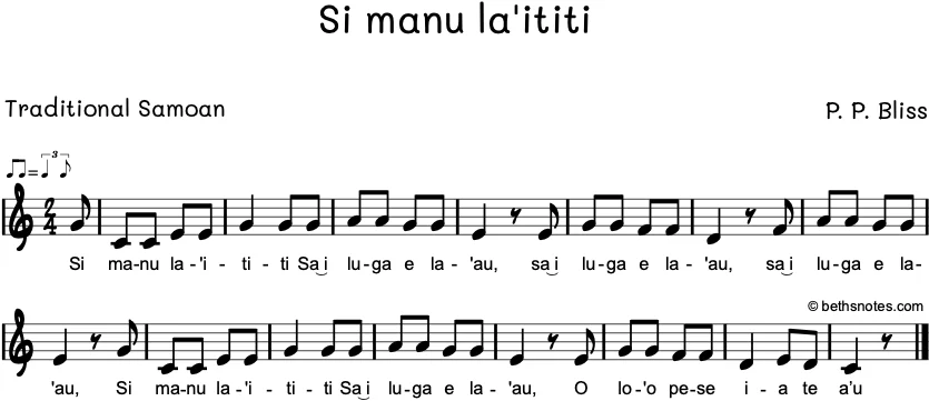 Lyrics – Samoan (Melody by P. P. Bliss, Traditional Samoan lyrics) Si manu la’ititi Sa i luga e la’auSa i luga e la’auSa i luga e la’auSi manu la’ititiSa i luga e la’auO lo’o pese ia te a’u English Translation ...