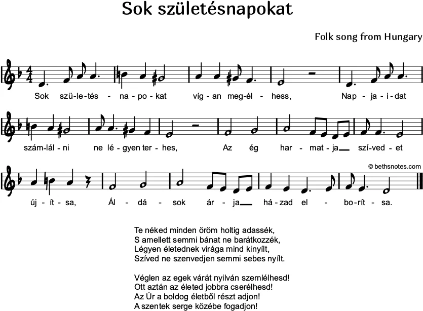 Info This is Hungary’s traditional birthday song. Lyrics (Folk song from Hungary) Sok születésnapokat vígan megélhess,Napjaidat számlálni ne légyen terhes,Az ég harmatja szívedet újítsa,Áldások árja házad elborítsa. Te néked minden öröm holtig adassék,S amellett semmi bánat ne barátkozzék,Légyen életednek virága ...