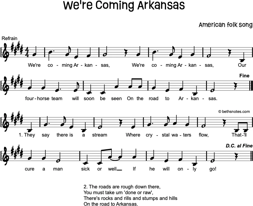 Lyrics (American folk song) RefrainWe’re coming ArkansasWe’re coming ArkansasOur four-horse team will soon be seenOn the road to Arkansas 1. They say there is a streamWhere crystal waters flow,That’ll cure a man sick or wellIf he will only go!Refrain 2. ...