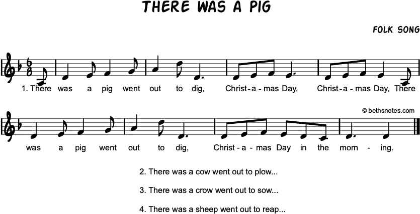 Lyrics (Folk song) 1. There was a pig went out to dig,Christ-a-mas Day, Christ-a-mas Day,here was a pig went out to dig,Christ-a-mas Day in the morning. 2. There was a cow went out to plow… 3. There was a crow ...