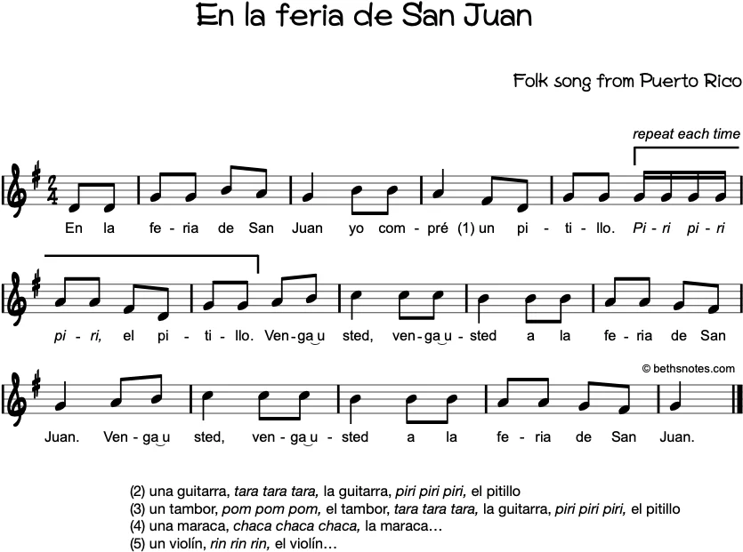 Lyrics – Spanish (Folk song from Puerto Rico) En la feria de San Juanyo compré (1) un pitillo.piri piri piri el pitilloVenga usted, venga usteda la feria de San Juan.Venga usted, venga usteda la feria de San Juan (2) una ...