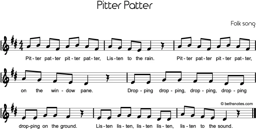 Lyrics (Folk song) Pitter patter pitter patterListen to the rain.Pitter patter pitter patterOn the window pane.Dropping dropping, dropping droppingDropping on the ground.Listen listen, listen listenListen to the sound. See also Subject: rain Harmony: I, V Melody: mi so / descending major pentascale (see ...