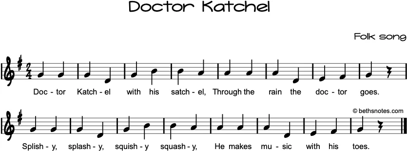 Lyrics (Folk song) Doctor Katchel with his satchel,Through the rain the doctor goes.Splishy splashy, squishy squashy,He makes music with his toes. See also Subject: doctor Dynamics: loud & soft Harmony: I, IV, V / ostinati Melody: low so, la, ti, do ...