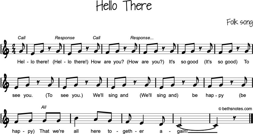 Lyrics (Folk song) Hello there (echo)How are you (echo)It’s so good (echo)To see you (echo)We’ll sing and (echo)Be happy (echo) ALL: That we’re all here together again! For fun, add “Cha cha cha!” at the end. Sign language hello how ...