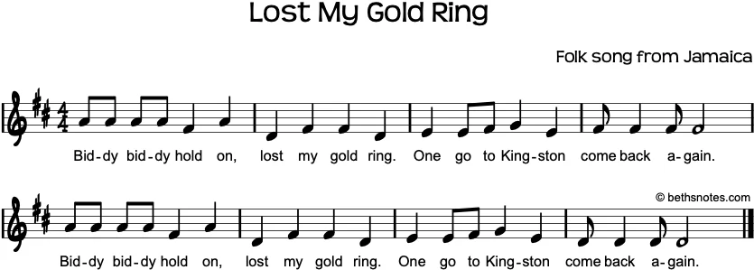 Version 1 Lyrics (Jamaican folk song) Biddy biddy hold on, lost my gold ring.One go to Kingston, come back again. (repeat) Recorder Notes G, A, B, C, D’ Lyrics (Jamaican folk song) Biddy biddy hold on, lost my gold ring.One ...