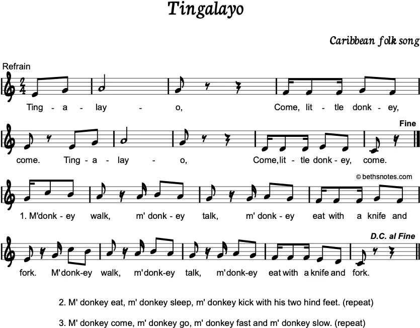Lyrics (Caribbean folk song) RefrainTingalayo, Come, little donkey, come. (repeat) 1. M’ donkey walk, m’ donkey talk, m’ donkey eat with a knife and fork. (repeat) 2. M’ donkey eat, m’ donkey sleep, m’ donkey kick with his two hind ...