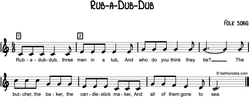 Lyrics (Folk song) Rub a dub three men in a tubAnd who do you think they be?The butcher, the baker, the candlestick maker,And all of them gone to sea. See also Subject: baking Type: nursery rhyme Harmony: I, V / ...