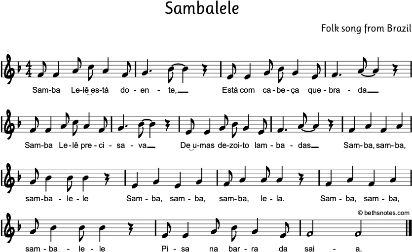 Lyrics – Portuguese (Brazilian folk song) Samba Lelê está doenteEstá com a cabeça quebradaSamba Lelê precisavaDe umas dezoito lambadas Samba, samba,Samba ô LelêPisa na barra da saia English Translation Sambalele is sickHe (or she) has a broken headSambalele needsEighteen spankings ...