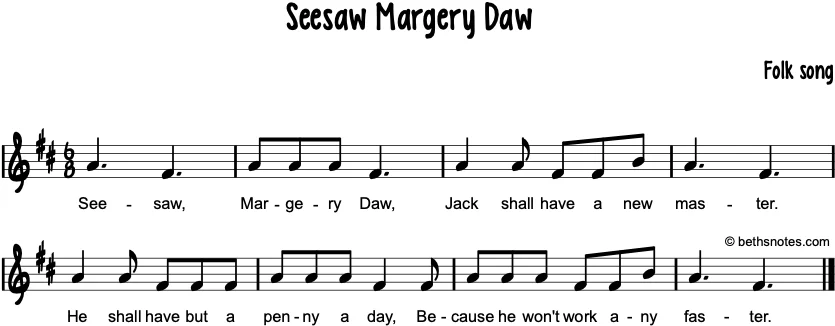 Version 1 Info The rhyme first appeared in its modern form in Mother Goose’s Melody, published in London in around 1765. (source) Lyrics (Folk song) Seesaw Margery Daw,Jack shall have a new master;He shall earn but a penny a day,Because ...
