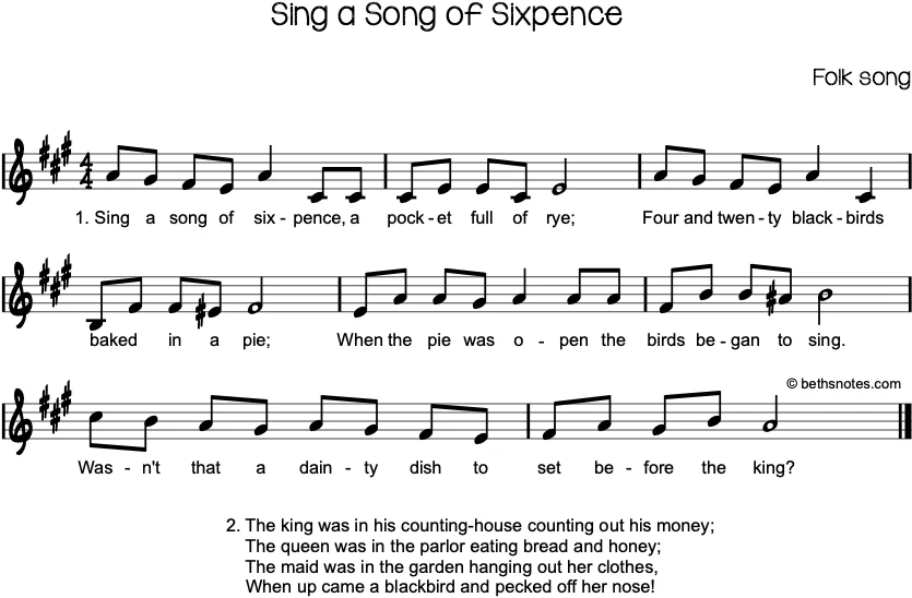 Version 1 Lyrics (Folk song) 1. Sing a song of sixpence, a pocket full of rye.Four and twenty blackbirds baked in a pie.When the pie was opened the birds began to sing;Wasn’t that a dainty dish to set before the ...