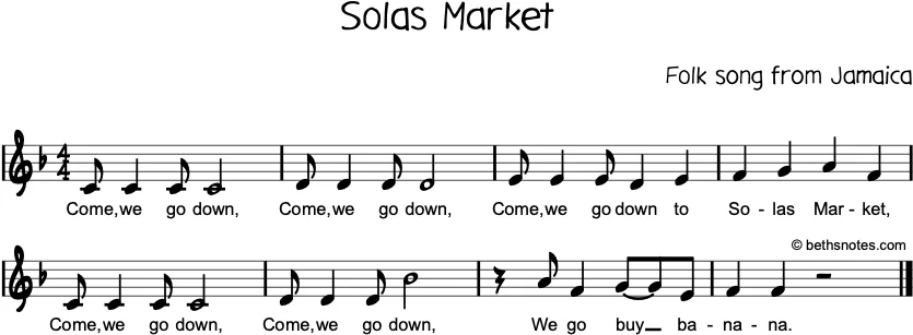 Lyrics (Jamaican folk song) Come, we go down, Come, we go down,Come, we go down to Solas Market,Come, we go down, Come, we go down,We go buy banana. See also Country: Jamaica Subject: food Harmony: I, IV, V / countermelodies ...