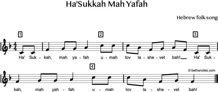 Info Sukkah is a temporary hut constructed for use during the week-long Jewish festival of Sukkot. (source) Lyrics – Transliteration (Hebrew folk song) Ha’ Sukkah, mah yafah umah tov lashevet bah! English Translation – The Sukkah is beautiful The Sukkah ...
