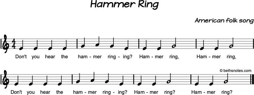 Lyrics (American folk song) Don’t you hear the hammer ringing?Hammer ring, hammer ring (repeat) See also Country: US Subject: Christmas Harmony: one chord / Orff Melody: mi so la / E,G,A Meter: 4 Scale: tritonic Tones: msl YouTube https://youtu.be/-mVHC9Meyfg or purchase ...