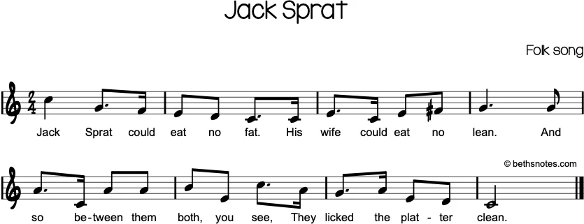 Lyrics (Folk song) Jack Sprat could eat no fat.His wife could eat no lean.And so between them both, you see,They licked the platter clean. See also Subject: Thanksgiving Type: nursery rhyme Harmony: Orff / ostinati Melody: G,C Meter: 2 Rhythm: long ...
