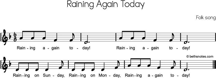 Lyrics (Folk song) Raining again today (repeat)Raining on Sunday, Raining on Monday,Raining again today Recorder Notes: E, G, B See also Subject: rain Harmony: I, V / major & minor / Orff Melody: tonic triad / E,G,B Meter: 6/8 Scale: ...