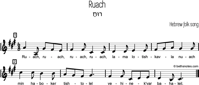 Lyrics – Transliteration (Hebrew folk song) Ruach, ruach, ruach, ruachLama lotish kavla ruachMin haboker tishtolelVehinek’var bahaleil. English Translation – Wind (Spirit) Wind, wind, wind, windWhy don’t you lay down to rest?From the morning you rage!And here already comes the night. ...