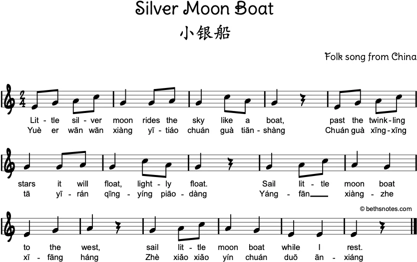 English – Transliteration (Chinese folk song) Yuè er wān wān xiàng yītiáo chuán guà tiānshàngChuán guà xīngxīng tā yīrán qīngyíng piāodàngYángfān xiàngzhe xīfāng hángZhè xiǎo xiǎo yín chuán duō ānxiáng Translation – Small Silver Boat The moon curved like a ...