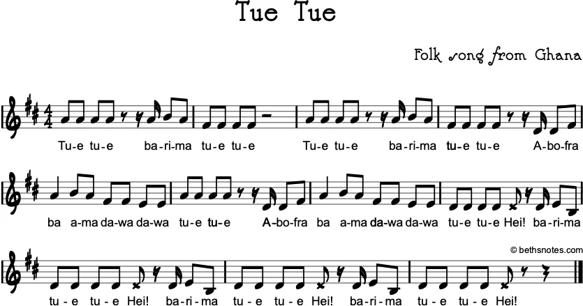 Lyrics – Ashanti (Folk song from Ghana) Tue tue barima tue tueAbofra baAma wa da waTue tue. English Translation* Sorry man sorry,This small boyHas made you fall flatSorry, sorry. *Translation is disputed. This meaning is from a source that states ...