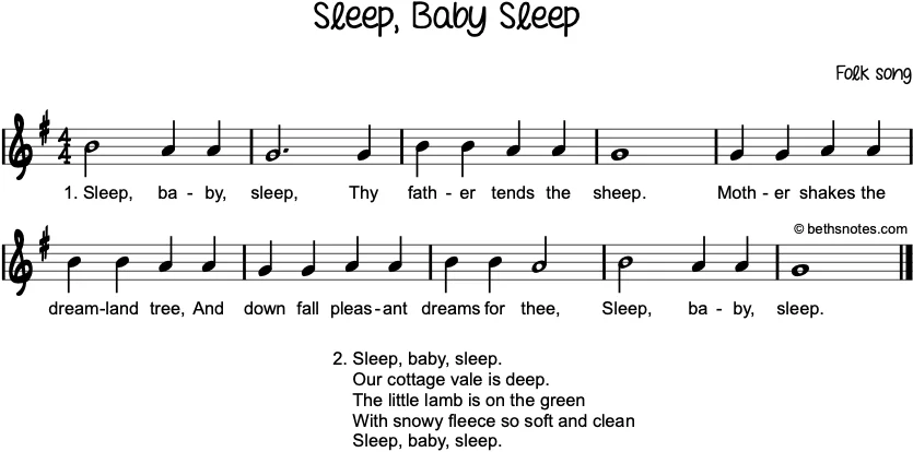 Lyrics (Folk song) 1. Sleep baby sleepThy father tends the sheep.Mother shakes the dreamland tree,And down fall pleasant dreams for thee,Sleep baby sleep. 2. Sleep baby sleepOur cottage vale is deepThe little lamb is on the greenWith snowy fleece so ...