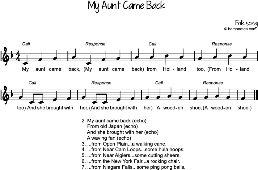 Lyrics (Folk song) 1. My aunt came back (echo)From Holland too (echo)And she brought with her (echo)A wooden shoe (echo) 2. …From old Japan…A waving fan. 3. …from Open Plain…a walking cane. 4. …from Near Cam Loops…some hula hoops. 5. ...