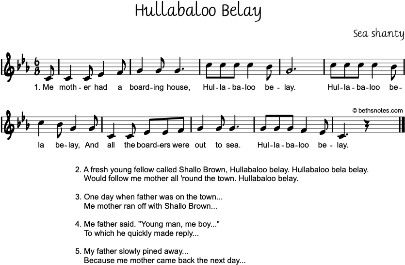 Lyrics (Sea shanty) 1. Me mother had a boarding house,Hullabaloo belay.Hullabaloo bela belay,And all the boarders were out to sea.Hullabaloo belay. 2. A fresh young fellow called Shallo Brown…Would follow me mother all ’round the town… 3. One day when ...