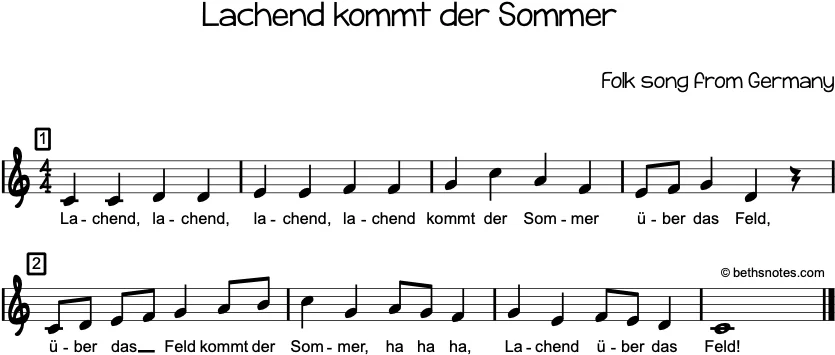 Lyrics – German (German folk song) Lachend, lachend, lachend, lachendKommt der Sommer über das Feld,Über das Feld kommt der Sommer, ha ha ha!Lachend über das Feld! English Translation – Summer Comes Laughing Laughing, laughing, laughing, laughingSummer comes over the fieldSummer is ...