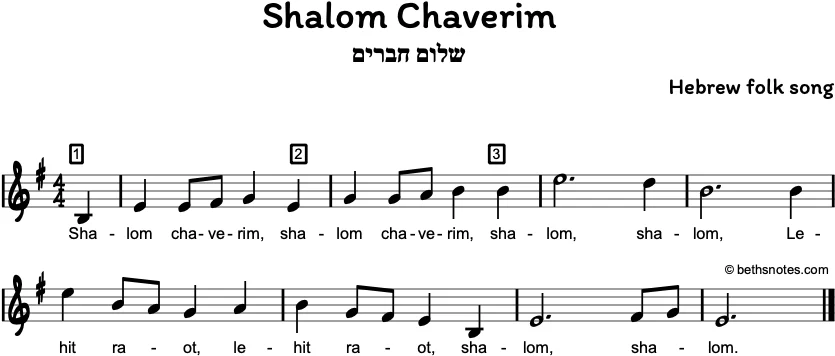 Lyrics – Transliteration (Hebrew folk song) Shalom Chaverim, shalom chaverim,Shalom, shalomL’hit-rah-oat, L’hit-rah-oatShalom, shalom English Translation – Peace friends Peace (hello) friends, hello friendsPeace, peaceGoodbye, goodbyePeace, peace Hebrew – שלום חברים שלום חברים, שלום חבריםשלום, שלוםלהתראות, להתראותשלום,שלום See also Language: Hebrew ...