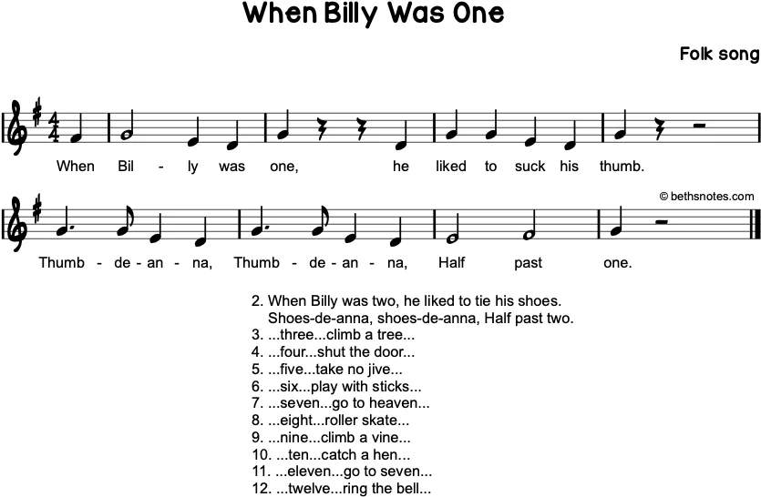 Lyrics (Folk song) When Billy was one,He liked to such his thumb.Thumb-deanna, Thumb-deanna,Half past one. 2. When Billy was two, he liked to tie his shoes.Shoes-de-anna, shoes-de-anna, Half past two. 3. …three…climb a tree… 4. …four…shut the door… 5. …five…take ...