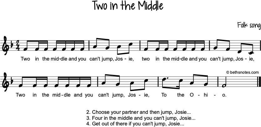 Lyrics (Folk song) 1. Two in the middle and you can’t jump, Josie, (repeat twice)To the Ohio. 2. Choose your partner and then jump, Josie… 3. Four in the middle and you can’t jump, Josie… 4. Get out of there ...
