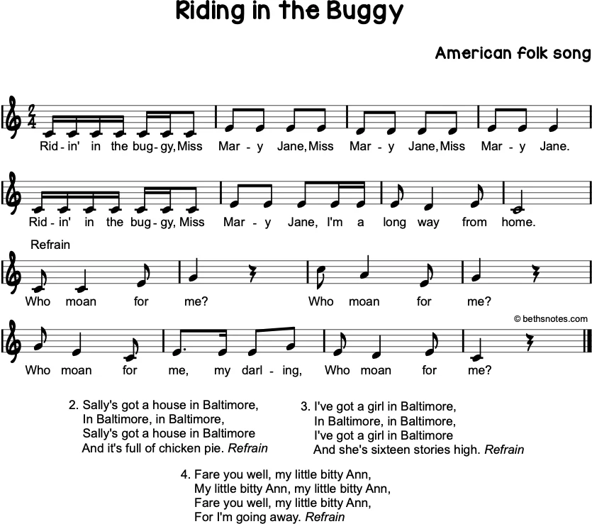 Lyrics (Folk song) Ridin’ in the buggy, Miss Mary Jane, Miss Mary Jane, Miss Mary Jane.Ridin’ in the buggy, Miss Mary Jane, I’m a long way from home. RefrainWho moan for me? Who moan for me?Who moan for me, my ...