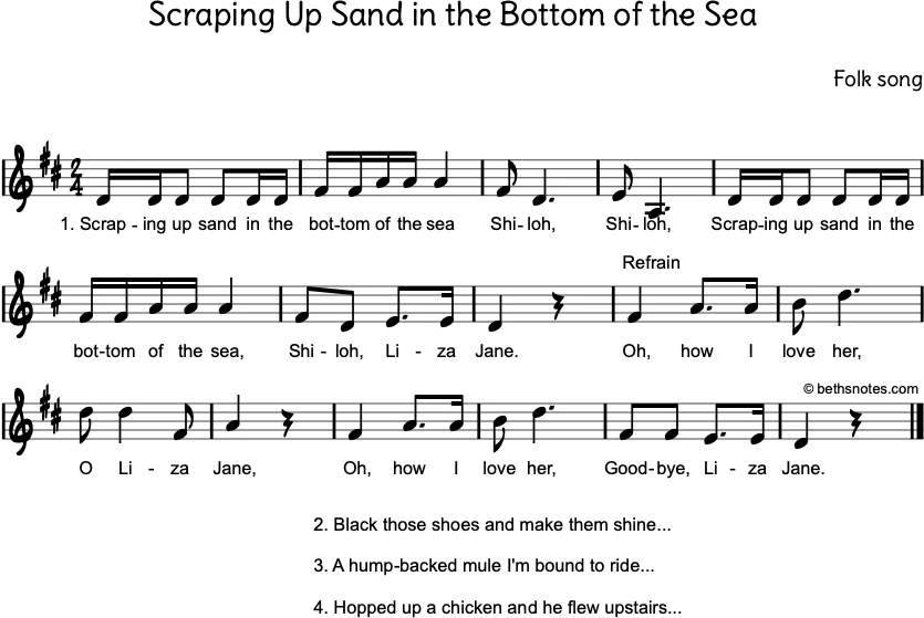 Lyrics (Folk song) 1. Scraping up sand in the bottom of the sea, Shiloh*, Shiloh,Scraping up sand in the bottom of the sea, Shiloh, Liza Jane. RefrainOh, how I love her, O Liza Jane,Oh, how I love her, Goodbye, Liza Jane. 2. ...