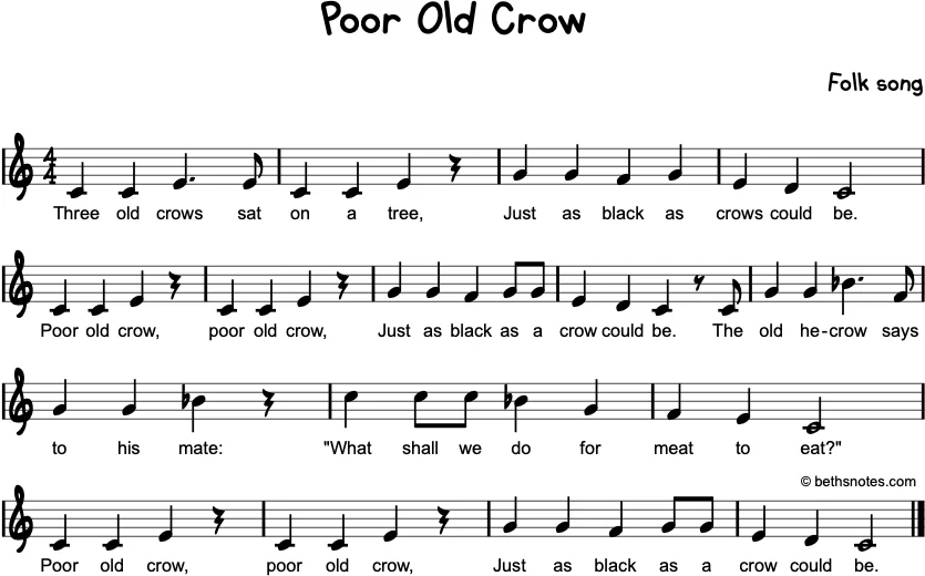 Lyrics (Folk song) Three old crows sat on a tree,Just as black as crows could be.Poor old crow, poor old crow,Just as black as a crow could be.The old he-crow says to his mate:“What shall we do for meat to ...